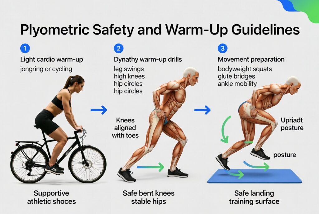 Get ready to train by warming up with some light activities like jogging or bicycling (five to ten minutes). Next add some dynamic moves such as leg swings, high knees, butt kicks and hip circles. These help in improving the flow as well as in soothing your muscles. Conclude with movement preparation exercises like body weight squats, glute bridges and mobility exercises on the ankle. These exercises improve landing skills and develop the muscles that you perform in making jumps and hopping.